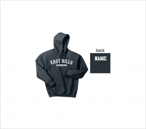 East Hills Band – Hooded Sweatshirt (Dark Heather Gray with White print) with screened logo on front