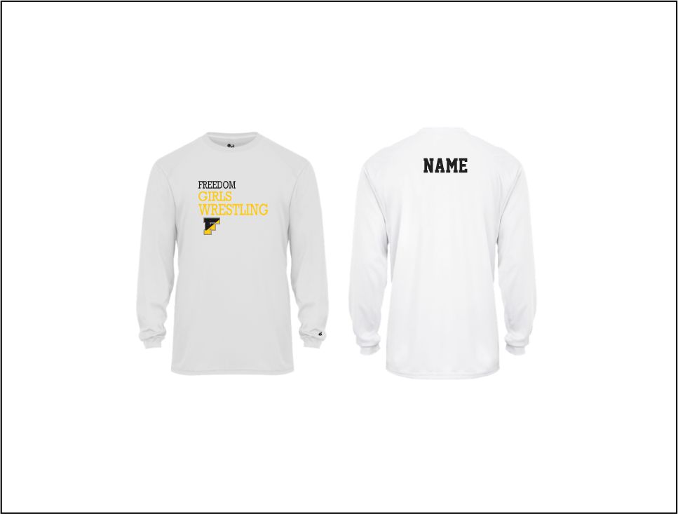 Freedom Girls Wrestling – Long Sleeve Performance shirt (White – logo #1) with screened logo on front