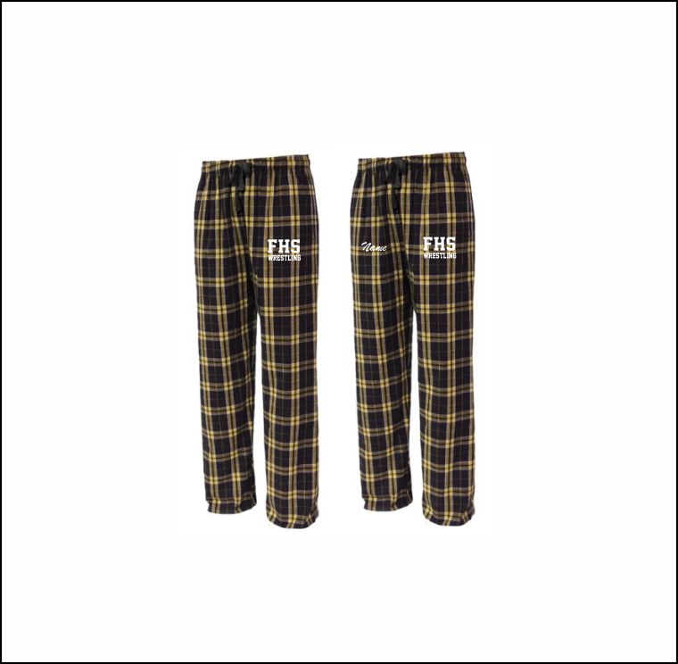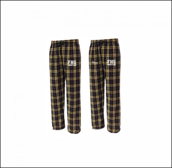 SKU: N/A Categories: Freedom Girls Wrestling, Freedom Wrestling Fundraiser Tag: Freedom Wrestling - Flannel Pants (Black/Gold) with left thigh logo
