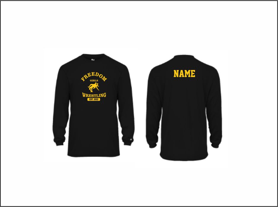 Freedom Girls Wrestling – Long Sleeve Performance shirt (Black – logo #2) with screened logo on front