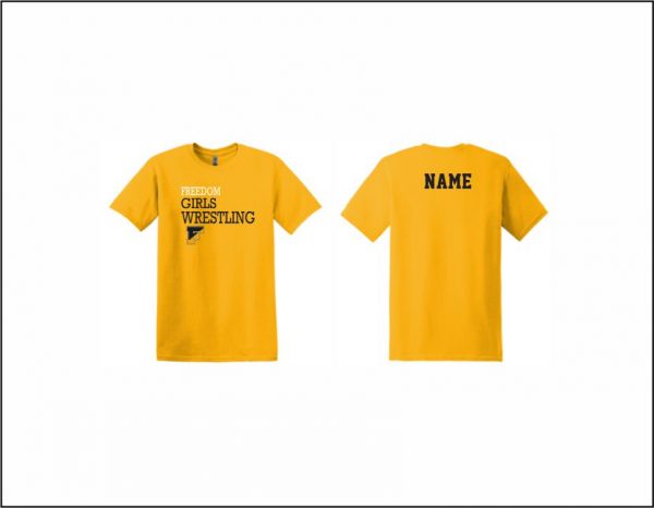 Freedom Girls Wrestling – Short Sleeve Cotton T-shirt (Gold – logo #1) with screened logo on front