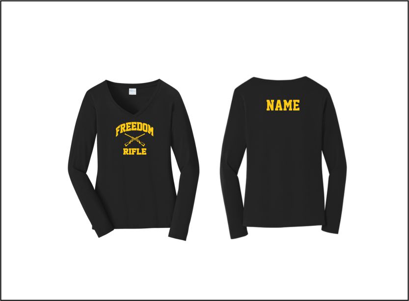 Freedom Rifle – Ladies Long Sleeve Tri-Blend V-Neck T-Shirt (Black) with screened logo on front
