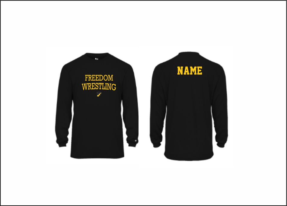 Freedom Wrestling –  Long Sleeve Performance shirt (Black – logo #1) with screened logo on front