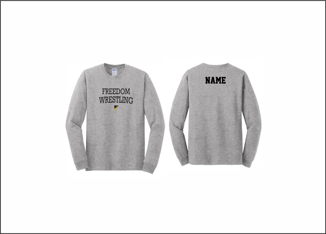 Freedom Wrestling –  Long Sleeve Cotton T-shirt (Gray – logo #1) with screened logo on front