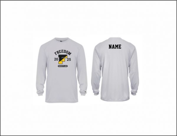 Freedom Wrestling –  Long Sleeve Performance shirt (Silver – logo #2) with screened logo on front