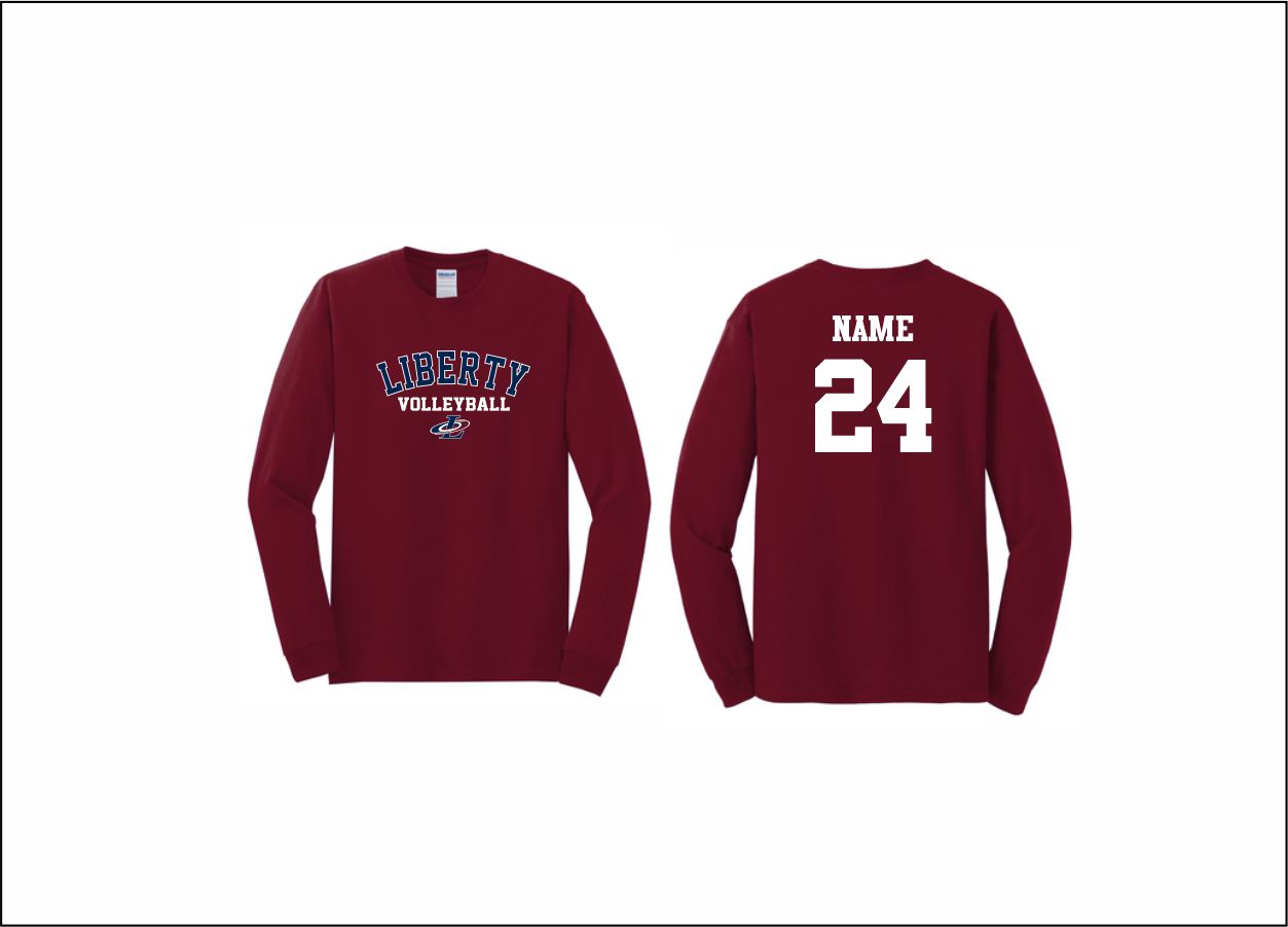 Liberty Volleyball – Long Sleeve Cotton T-Shirt (Cardinal) with logo on front