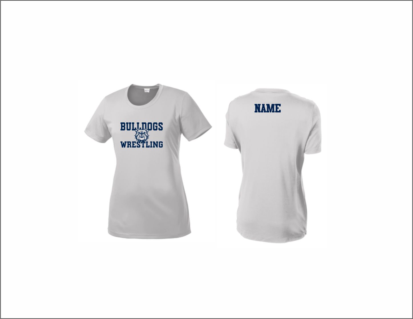 Northern Lehigh Wrestling – Ladies Short Sleeve Performance Shirt (Silver) with logo on front