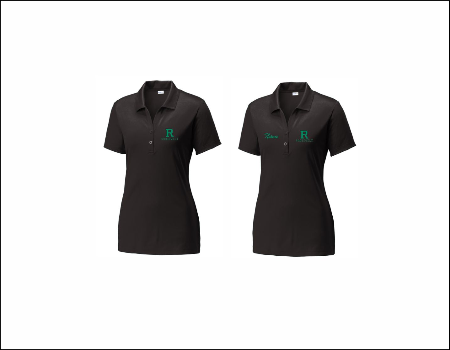 Roosevelt Elementary – Ladies Short Sleeve Performance Polo (Black) with embroidered logo left chest