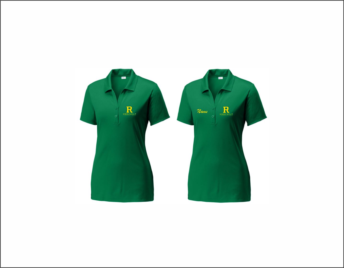 Roosevelt Elementary – Ladies Short Sleeve Performance Polo (Green) with embroidered logo left chest