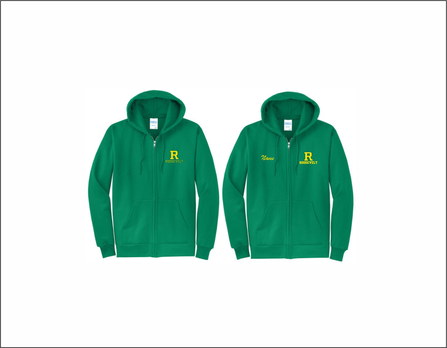 Roosevelt Elementary – Full Zip Hooded Sweatshirt (Green) with embroidered logo left chest