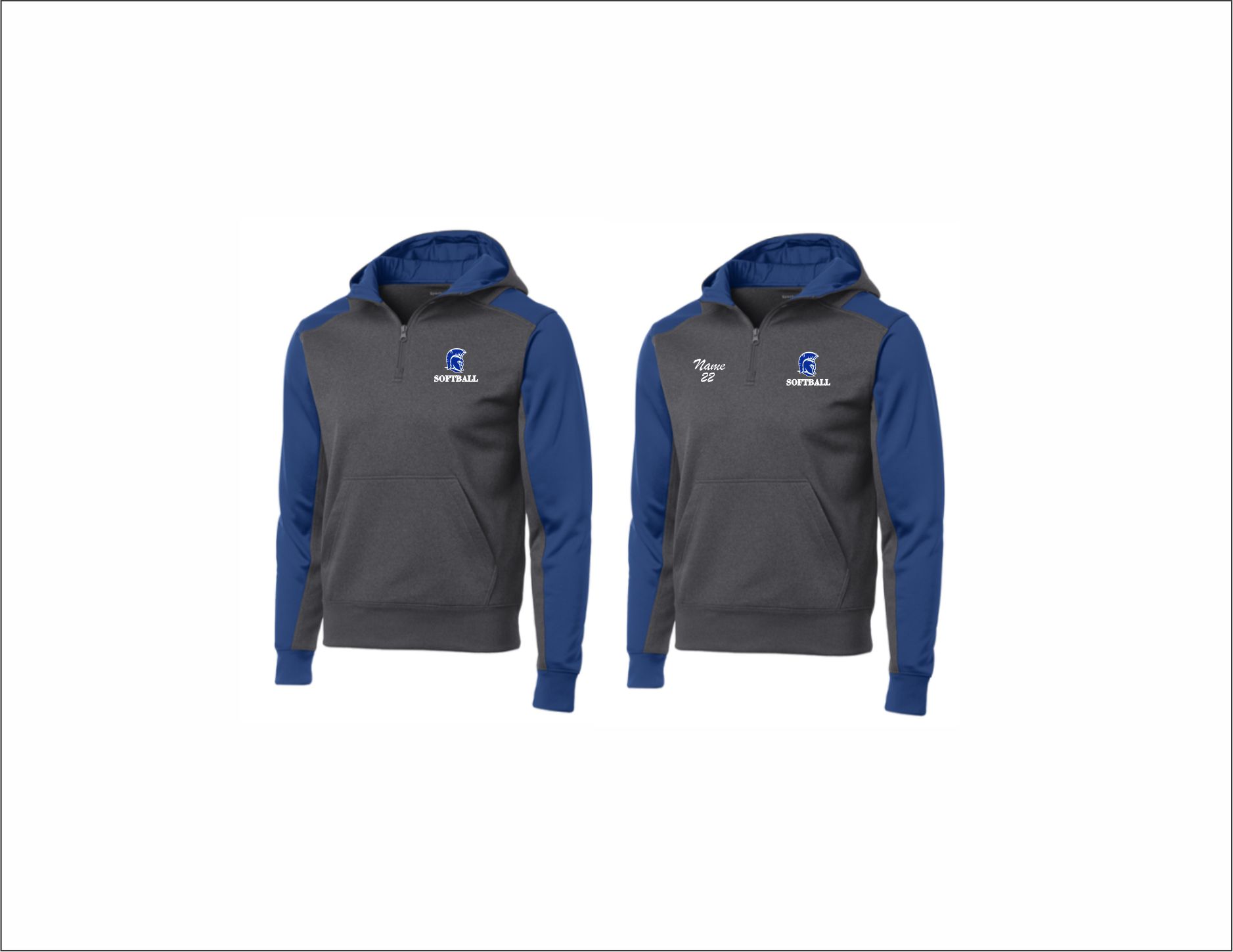 Spartans Softball – 1/4 Zip Colorblock Hooded Sweatshirt (Graphite Heather/Royal) with embroidered logo on front