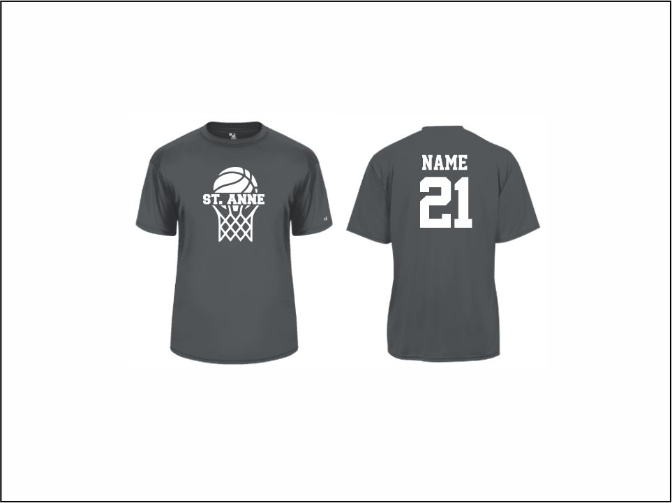 St. Anne Basketball – Short Sleeve Performance Shirt (Charcoal – Logo #2) with screened logo on front