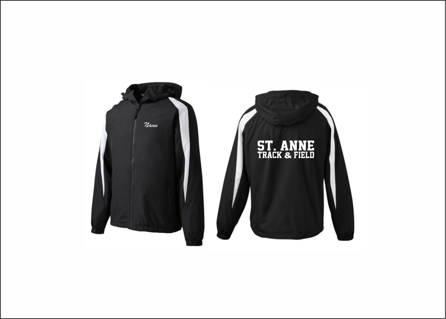 St. Anne Track & Field – Fleece Lined Lightweight Hooded Jacket (Black/White) with heat applied back