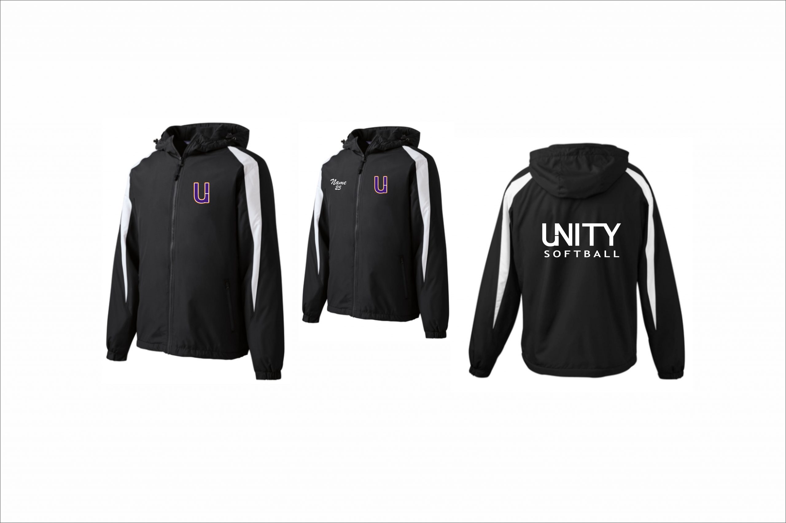 Unity Softball – Lightweight Fleece Lined Full Zip Jacket (Black/White) with embroidered logo left chest & heat applied back