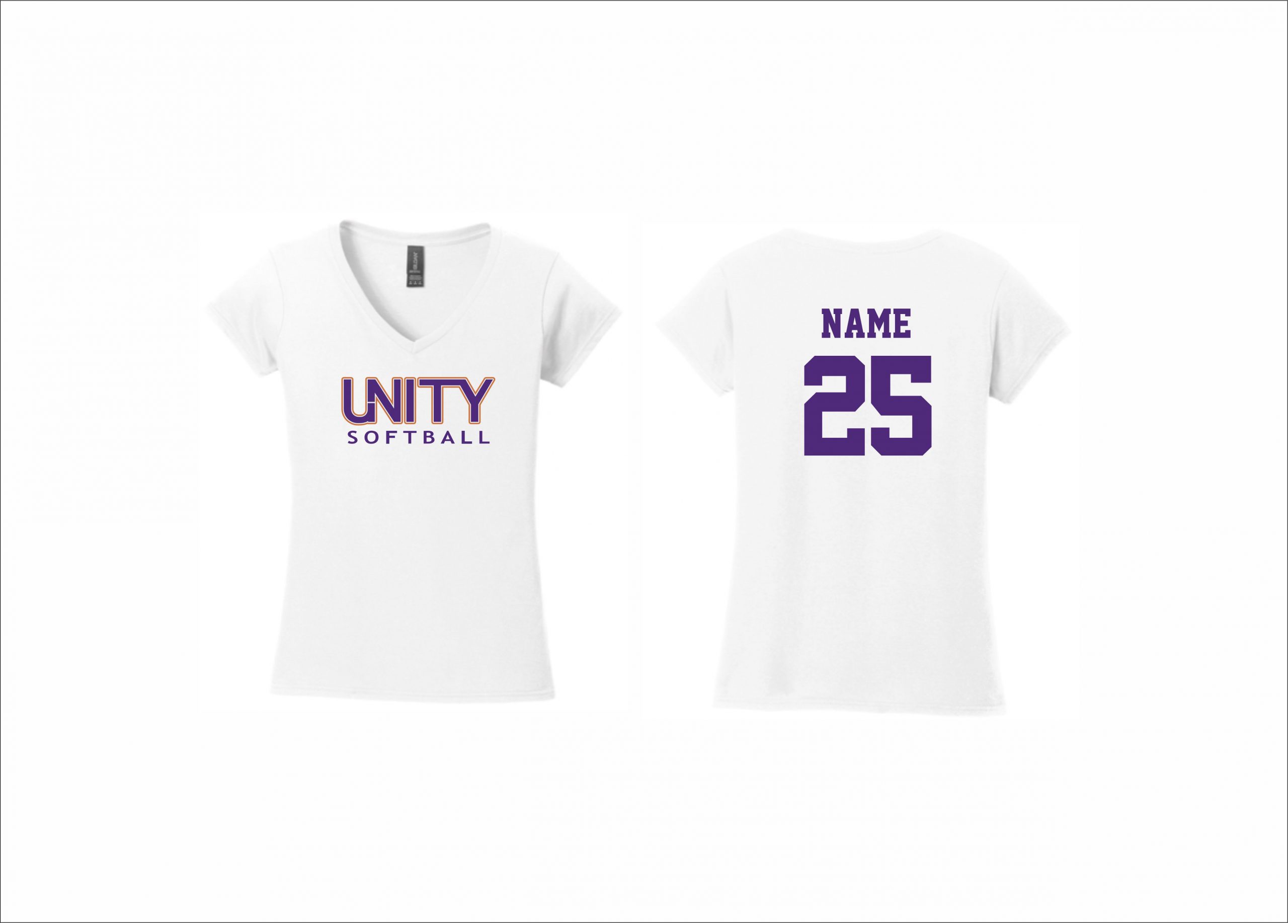 Unity Softball – Ladies Short Sleeve Softstyle V-Neck T-Shirt (white) with logo on front